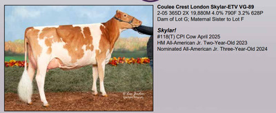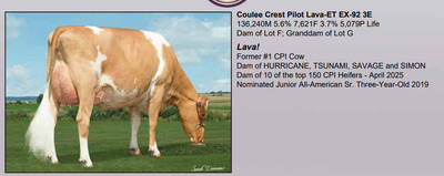 Selling five (5) #1 IVF embryos sired by Legacy out of Coulee Crest Pilot Lava-ET. Sexed semen used for females. Resulting calves will be A2A2 by extended parentage and would rank in the top 115 CPI Heifers - April 2025.