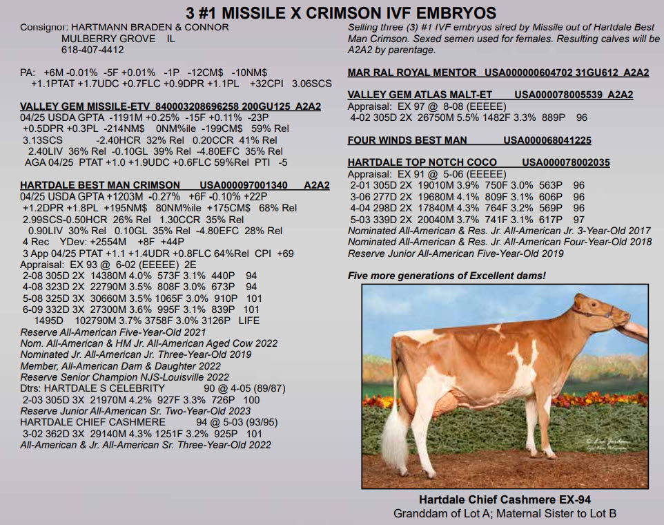 Selling three (3) #1 IVF embryos sired by Missile out of Hartdale Best