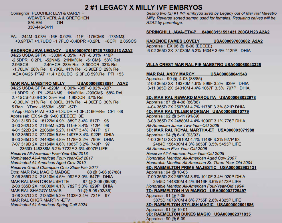 Selling two (2) #1 IVF embryos sired by Legacy out of Mar Ral Maestro