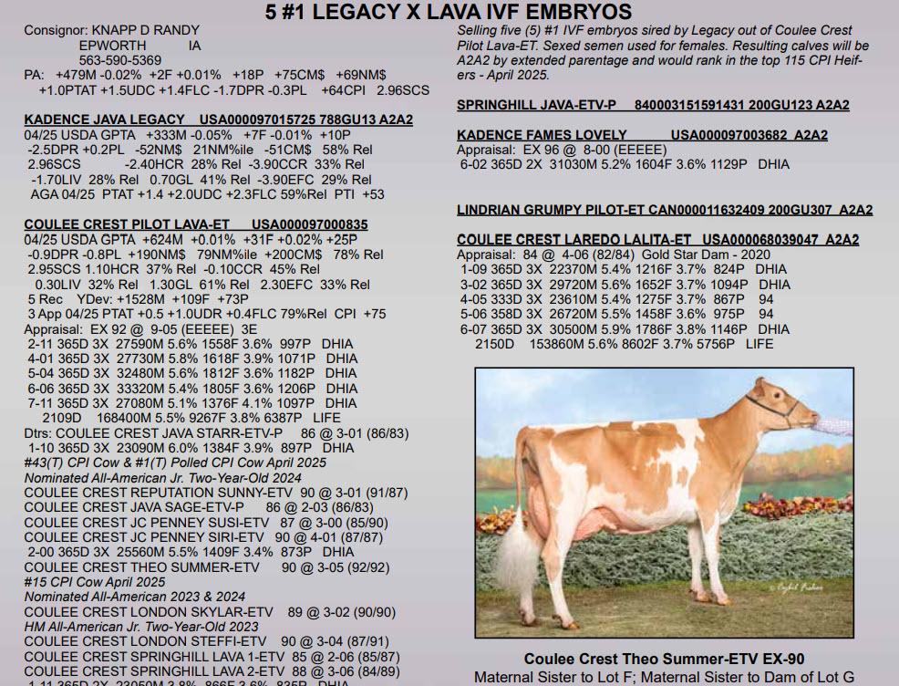 Selling five (5) #1 IVF embryos sired by Legacy out of Coulee Crest