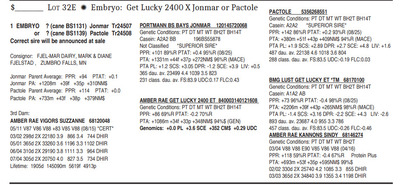 1 EMBRYO ? (cane BS1131) Jonmar Tr24507 or ? (cane BS1139) Pactole Tr24508 Correct sire will be announced at sale Consignor: FJEL-MAR DAIRY, MARK & DIANE FJELSTAD , ZUMBRO FALLS, MN Jonmar Parent Average: PPR: +94 PTAT: +0.1 Jonmar PA: +1208m +39f +35p +310NM$ Pactole Parent Average: PPR: +114 PTAT: +0.0 Pactole PA: +733m +43f +38p +379NM$