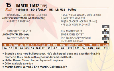 Scout is a nice herd bull prospect. He’s big hipped, deep and easy fleshing. His mother is thick made with a good udder and small teats.