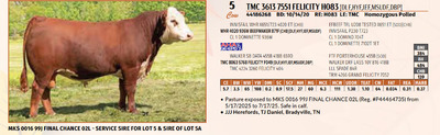 Bred by AI to JW 1857 MERIT 21134 (Reg. #P44212986) on 5/8/25, then pasture exposed to THM Coleman 2056 ET (