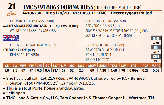 She has a bull calf, Lot 21A (Reg. #P44694003), at side sired by KCF Bennett