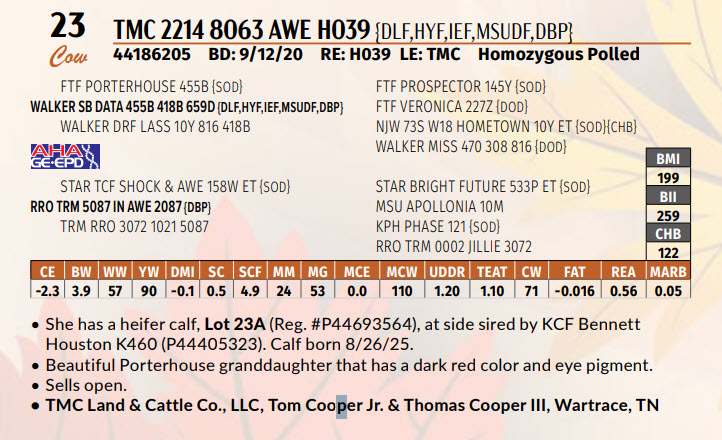 She has a heifer calf, Lot 23A (Reg. #P44693564), at side sired by KCF Bennett
