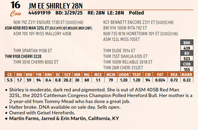 Shirley is moderate, dark red and pigmented. She is out of ASM 405B Red Man 325L, the 2025 Cattleman Congress Champion Polled Hereford Bull. Her mother is a 2-year-old from Tommy Mead who has done a great job.