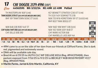 49M came to us on the side of her dam from our friends at Clifford Farms. She is dark red, pigmented and extremely sound.