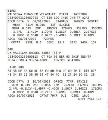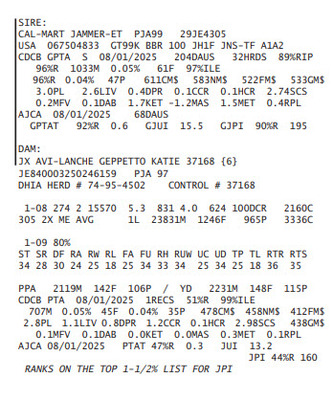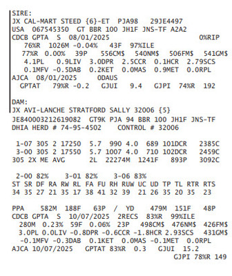 BORN 11/17/2024 P9 PJA 98 BBR 100 FEMALE EFI 7.5% AMERICAN ID 927/927 JH1F JNS-TF BRED: 10/07/2025 DUE: 07/13/2026 TO JX PEAK ALTADRONE {5}-ET PJA97 11JE7712 JE840003272457101 BBR 100 JH1F JNS-TF A2A2 CDCB GPTA S 08/01/2025 0%RIP 77%R 1083M 0.00% 55F 97%ILE 77%R 0.00% 41P 566CM$ 551NM$ 518FM$ 487GM$ 4.0PL -0.4LIV -1.1DPR -1.0CCR 0.9HCR 2.85SCS 0.0MFV 0.1DAB 0.0KET -2.0MAS 0.0MET -0.1RPL AJCA 08/01/2025 0DAUS GPTAT 80%R 0.5 GJUI 16.0 GJPI 75%R 173 RANKS 115TH IN THE BREED FOR GJPI #1 JPI CLOONEY DAUGHTER DONOR DAM