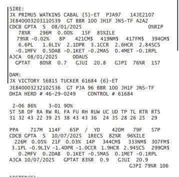 1.3 -0.4 -0.6 S1.6 W0.7 L0.1 W1.1 B0 BRED: 07/09/2025 DUE: 04/14/2026 TO