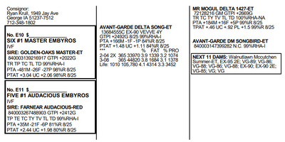 The BARRON FALL SALE 2025 120 N. 3rd Street, Barron WI, 54812 Great offering of genetics... Contact Agent: Aaron Ray Tompkins 336-363-4639 Catalog | Terms of Auction Download CATALOG Download ADDED LOTS PAGE 1 Download ADDED LOTS PAGE 2 Download ADDED LOTS PAGE 3 Catalog | Terms Download CATALOG Download ADDED LOTS PAGE 1 Download ADDED LOTS PAGE 2 Download ADDED LOTS PAGE 3 All Items (132) Cattle (102) Embryos (12) Semen (18) Categories All Items (132) Cattle (102) Embryos (12) Semen (18) Search Item #: Keyword: Search Catalog Item #: Keyword: 20 items per page 50 items per page 100 items per page Go to page #: 1 #1E – ALTITUDE X LUMINEER EMBRYOS THREE #1 ALTITUDE EMBRYOS Location: 120 N. 3rd Street, Barron WI, 54812 Contact Agent: Aaron Ray Tompkins 336-363-4639 More Info / Bid Now Track this Item Sold High Bid: $250.00 – #1077 Auction Type: Quantity x Price Quantity: 3 #1E – ALTITUDE X LUMINEER EMBRYOS Quantity x PriceQuantity: 3 Sold High Bid: $250 More Details More Info / Bid Track Item THREE #1 ALTITUDE EMBRYOS Location: 120 N. 3rd Street, Barron WI, 54812 Contact Agent: Aaron Ray Tompkins 336-363-4639 #2E – MOOVIN X LUMINEER EMBRYOS THREE #1 MOOVIN EMBRYOS Location: 120 N. 3rd Street, Barron WI, 54812 Contact Agent: Aaron Ray Tompkins 336-363-4639 More Info / Bid Now Track this Item Sold High Bid: $350.00 – #86 Auction Type: Quantity x Price Quantity: 3 #2E – MOOVIN X LUMINEER EMBRYOS Quantity x PriceQuantity: 3 Sold High Bid: $350 More Details More Info / Bid Track Item THREE #1 MOOVIN EMBRYOS Location: 120 N. 3rd Street, Barron WI, 54812 Contact Agent: Aaron Ray Tompkins 336-363-4639 #3E – PALDWYN, DROPBOX X ARLA EMBRYOS ONE #1 PALDWYN EMBRYO TWO #1 DROPBOX EMBRYOS ONE #2 DROPBOX EMBRYO Sexed IVF Located at Trans Ova Genetics, Madison Embryos qualify for EU, Can, UK Location: 120 N. 3rd Street, Barron WI, 54812 Contact Agent: Aaron Ray Tompkins 336-363-4639 More Info / Bid Now Track this Item Sold High Bid: $425.00 – #1064 Auction Type: Quantity x Price Quantity: 4 #3E – PALDWYN, DROPBOX X ARLA EMBRYOS Quantity x PriceQuantity: 4 Sold High Bid: $425 More Details More Info / Bid Track Item ONE #1 PALDWYN EMBRYO TWO #1 DROPBOX EMBRYOS ONE #2 DROPBOX EMBRYO Sexed IVF Located at Trans Ova Genetics, Madison Embryos qualify for EU, Can, UK Location: 120 N. 3rd Street, Barron WI, 54812 Contact Agent: Aaron Ray Tompkins 336-363-4639 #4E – SHEEPSTER X DRAMA EMBRYOS THREE #1 SHEEPSTER EMBRYOS THREE #2 SHEEPSTER EMBRYOS Sexed IVF Located at Trans Ova Genetics, Madison Qualify for Can, UK Location: 120 N. 3rd Street, Barron WI, 54812 Contact Agent: Aaron Ray Tompkins 336-363-4639 More Info / Bid Now Track this Item Sold High Bid: $475.00 – #86 Auction Type: Quantity x Price Quantity: 6 #4E – SHEEPSTER X DRAMA EMBRYOS Quantity x PriceQuantity: 6 Sold High Bid: $475 More Details More Info / Bid Track Item THREE #1 SHEEPSTER EMBRYOS THREE #2 SHEEPSTER EMBRYOS Sexed IVF Located at Trans Ova Genetics, Madison Qualify for Can, UK Location: 120 N. 3rd Street, Barron WI, 54812 Contact Agent: Aaron Ray Tompkins 336-363-4639 #5E – JERRY LEWIS X CAUGHT A VIBE EMBRYOS FOUR #1 JERRY LEWIS EMBRYOS TWO #2 JERRY LEWIS EMBRYOS Sexed IVF Located at Trans Ova Genetics, Madison Qualify for EU, Can, UK Location: 120 N. 3rd Street, Barron WI, 54812 Contact Agent: Aaron Ray Tompkins 336-363-4639 More Info / Bid Now Track this Item Sold High Bid: $575.00 – #1079 Auction Type: Quantity x Price Quantity: 6 #5E – JERRY LEWIS X CAUGHT A VIBE EMBRYOS Quantity x PriceQuantity: 6 Sold High Bid: $575 More Details More Info / Bid Track Item FOUR #1 JERRY LEWIS EMBRYOS TWO #2 JERRY LEWIS EMBRYOS Sexed IVF Located at Trans Ova Genetics, Madison Qualify for EU, Can, UK Location: 120 N. 3rd Street, Barron WI, 54812 Contact Agent: Aaron Ray Tompkins 336-363-4639 #6E – ALPHA X MAY RED EMBRYOS FIVE #1 BLONDIN ALPHA EMBRYOS IVF Location: 120 N. 3rd Street, Barron WI, 54812 Contact Agent: Aaron Ray Tompkins 336-363-4639 More Info / Bid Now Track this Item Sold High Bid: $375.00 – #10038 Auction Type: Quantity x Price Quantity: 5 #6E – ALPHA X MAY RED EMBRYOS Quantity x PriceQuantity: 5 Sold High Bid: $375 More Details More Info / Bid Track Item FIVE #1 BLONDIN ALPHA EMBRYOS IVF Location: 120 N. 3rd Street, Barron WI, 54812 Contact Agent: Aaron Ray Tompkins 336-363-4639 #7E – MEGA P RED X BOPEEP EMBRYOS FIVE #1 MEGA-P-RED EMBRYOS IVF Location: 120 N. 3rd Street, Barron WI, 54812 Contact Agent: Aaron Ray Tompkins 336-363-4639 More Info / Bid Now Track this Item Sold High Bid: $275.00 – #1038 Auction Type: Quantity x Price Quantity: 5 #7E – MEGA P RED X BOPEEP EMBRYOS Quantity x PriceQuantity: 5 Sold High Bid: $275 More Details More Info / Bid Track Item FIVE #1 MEGA-P-RED EMBRYOS IVF Location: 120 N. 3rd Street, Barron WI, 54812 Contact Agent: Aaron Ray Tompkins 336-363-4639 #8E – EYE CANDY X LAST SONG EMBRYOS FIVE #1 EYE CANDY EMBRYOS Location: 120 N. 3rd Street, Barron WI, 54812 Contact Agent: Aaron Ray Tompkins 336-363-4639 More Info / Bid Now Track this Item Sold High Bid: $375.00 – #79 Auction Type: Quantity x Price Quantity: 5 #8E – EYE CANDY X LAST SONG EMBRYOS Quantity x PriceQuantity: 5 Sold High Bid: $375 More Details More Info / Bid Track Item FIVE #1 EYE CANDY EMBRYOS Location: 120 N. 3rd Street, Barron WI, 54812 Contact Agent: Aaron Ray Tompkins 336-363-4639 #9E – KNACK X HESTIA EMBRYOS FIVE #1 KNACK EMBRYOS ONE #2 KNACK EMBRYOS Sexed IVF Located at Trans Ova Genetics, Madison Qualify for Can, UK Location: 120 N. 3rd Street, Barron WI, 54812 Contact Agent: Aaron Ray Tompkins 336-363-4639 More Info / Bid Now Track this Item Sold High Bid: $625.00 – #1013 Auction Type: Quantity x Price Quantity: 6 #9E – KNACK X HESTIA EMBRYOS Quantity x PriceQuantity: 6 Sold High Bid: $625 More Details More Info / Bid Track Item FIVE #1 KNACK EMBRYOS ONE #2 KNACK EMBRYOS Sexed IVF Located at Trans Ova Genetics, Madison Qualify for Can, UK Location: 120 N. 3rd Street, Barron WI, 54812 Co