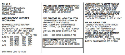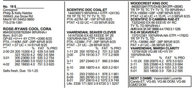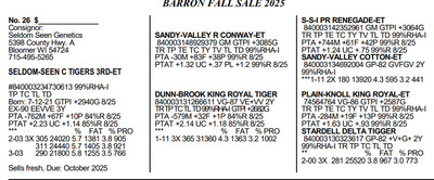 The BARRON FALL SALE 2025 120 N. 3rd Street, Barron WI, 54812 Great offering of genetics... Contact Agent: Aaron Ray Tompkins 336-363-4639 Catalog | Terms of Auction Download CATALOG Download ADDED LOTS PAGE 1 Download ADDED LOTS PAGE 2 Download ADDED LOTS PAGE 3 Catalog | Terms Download CATALOG Download ADDED LOTS PAGE 1 Download ADDED LOTS PAGE 2 Download ADDED LOTS PAGE 3 All Items (132) Cattle (102) Embryos (12) Semen (18) Categories All Items (132) Cattle (102) Embryos (12) Semen (18) Search Item #: Keyword: Search Catalog Item #: Keyword: 20 items per page 50 items per page 100 items per page Go to page #: 1 , 2 , 3 , 4 , 5 , 6 #14S – Regancrest Elton Durham-ET Regancrest Elton Durham-ET Location: 120 N. 3rd Street, Barron WI, 54812 Contact Agent: Aaron Ray Tompkins 336-363-4639 More Info / Bid Now Track this Item Sold High Bid: $60.00 – #34 Auction Type: Quantity x Price Quantity: 8 #14S – Regancrest Elton Durham-ET Quantity x PriceQuantity: 8 Sold High Bid: $60 More Details More Info / Bid Track Item Regancrest Elton Durham-ET Location: 120 N. 3rd Street, Barron WI, 54812 Contact Agent: Aaron Ray Tompkins 336-363-4639 #15 – OBRIEN DOC AWAY #840003255829264 99%RHA-I TR TP TC TL TD Born: 11-25-23 GTPI +2387G 8/25 PTA -581M -1F -12P 81%R 8/25 PTAT +1.68 UC +1.03 81%R 8/25 Due: 11-7-25 to Angus Location: 120 N. 3rd Street, Barron WI, 54812 Contact Agent: Aaron Ray Tompkins 336-363-4639 More Info / Bid Now Track this Item Sold High Bid: $2,800.00 – #19 #15 – OBRIEN DOC AWAY Sold High Bid: $2,800 More Details More Info / Bid Track Item #840003255829264 99%RHA-I TR TP TC TL TD Born: 11-25-23 GTPI +2387G 8/25 PTA -581M -1F -12P 81%R 8/25 PTAT +1.68 UC +1.03 81%R 8/25 Due: 11-7-25 to Angus Location: 120 N. 3rd Street, Barron WI, 54812 Contact Agent: Aaron Ray Tompkins 336-363-4639 #15S – KHW Elm-Park Acme-ET RC KHW Elm-Park Acme-ET RC Location: 120 N. 3rd Street, Barron WI, 54812 Contact Agent: Aaron Ray Tompkins 336-363-4639 More Info / Bid Now Track this Item Sold High Bid: $10.00 – #10 Auction Type: Quantity x Price Quantity: 5 #15S – KHW Elm-Park Acme-ET RC Quantity x PriceQuantity: 5 Sold High Bid: $10 More Details More Info / Bid Track Item KHW Elm-Park Acme-ET RC Location: 120 N. 3rd Street, Barron WI, 54812 Contact Agent: Aaron Ray Tompkins 336-363-4639 #16 – AL-SAL ARCANA-RED Born: 6-06-23 GP-84 ++V++ 2Y PTPI +2242 8/25 PTA -1014M -32F -22P 44%R 8/25 PTAT +2.17 UC +1.52 44%R 8/25 *** % FAT % PRO 1-11 2X 112 7159 3.4%F 3.0%P” Milked 74#/day SCC: 38" Bred: 9-6-25 to SHG Lazer-ET RC #717630582 DNK Location: 120 N. 3rd Street, Barron WI, 54812 Contact Agent: Aaron Ray Tompkins 336-363-4639 More Info / Bid Now Track this Item Sold High Bid: $2,750.00 – #82 #16 – AL-SAL ARCANA-RED Sold High Bid: $2,750 More Details More Info / Bid Track Item Born: 6-06-23 GP-84 ++V++ 2Y PTPI +2242 8/25 PTA -1014M -32F -22P 44%R 8/25 PTAT +2.17 UC +1.52 44%R 8/25 *** % FAT % PRO 1-11 2X 112 7159 3.4%F 3.0%P” Milked 74#/day SCC: 38" Bred: 9-6-25 to SHG Lazer-ET RC #717630582 DNK Location: 120 N. 3rd Street, Barron WI, 54812 Contact Agent: Aaron Ray Tompkins 336-363-4639 #16S – Valleyriver Joyboy-Red Valleyriver Joyboy-Red Location: 120 N. 3rd Street, Barron WI, 54812 Contact Agent: Aaron Ray Tompkins 336-363-4639 More Info / Bid Now Track this Item Sold High Bid: $5.00 – #86 Auction Type: Quantity x Price Quantity: 6 #16S – Valleyriver Joyboy-Red Quantity x PriceQuantity: 6 Sold High Bid: $5 More Details More Info / Bid Track Item Valleyriver Joyboy-Red Location: 120 N. 3rd Street, Barron WI, 54812 Contact Agent: Aaron Ray Tompkins 336-363-4639 #17 – OBRIEN MOONRAKER PEEWEE #840003255829265 99%RHA-I Born: 11-27-23 TR TP TC TL TD GTPI +2270G 8/25 PTA -2094M -33F -37P 80%R 8/25 PTAT +2.50 UC +1.65 78%R 8/25 Due: 11-7-25 Location: 120 N. 3rd Street, Barron WI, 54812 Contact Agent: Aaron Ray Tompkins 336-363-4639 More Info / Bid Now Track this Item Sold High Bid: $1,600.00 – #1067 #17 – OBRIEN MOONRAKER PEEWEE Sold High Bid: $1,600 More Details More Info / Bid Track Item #840003255829265 99%RHA-I Born: 11-27-23 TR TP TC TL TD GTPI +2270G 8/25 PTA -2094M -33F -37P 80%R 8/25 PTAT +2.50 UC +1.65 78%R 8/25 Due: 11-7-25 Location: 120 N. 3rd Street, Barron WI, 54812 Contact Agent: Aaron Ray Tompkins 336-363-4639 #17S – Lutz-Meadows Mandel-ET Lutz-Meadows Mandel-ET Location: 120 N. 3rd Street, Barron WI, 54812 Contact Agent: Aaron Ray Tompkins 336-363-4639 More Info / Bid Now Track this Item Sold High Bid: $10.00 – #86 Auction Type: Quantity x Price Quantity: 10 #17S – Lutz-Meadows Mandel-ET Quantity x PriceQuantity: 10 Sold High Bid: $10 More Details More Info / Bid Track Item Lutz-Meadows Mandel-ET Location: 120 N. 3rd Street, Barron WI, 54812 Contact Agent: Aaron Ray Tompkins 336-363-4639 #18 – BWFW-AB ALL NTE LONG-RED-ET #840003208772447 99%RHA-I Born; 12-02-23 GTPI +2230G 8/25 PTA -1444M -12F -29P 82%R 8/25 PTAT +1.68 UC +1.24 82%R 8/25 Due: 12-27-25 to Farnear Architect-ET #840003214251590 (sexed) Location: 120 N. 3rd Street, Barron WI, 54812 Contact Agent: Aaron Ray Tompkins 336-363-4639 More Info / Bid Now Track this Item Sold High Bid: $3,800.00 – #500 #18 – BWFW-AB ALL NTE LONG-RED-ET Sold High Bid: $3,800 More Details More Info / Bid Track Item #840003208772447 99%RHA-I Born; 12-02-23 GTPI +2230G 8/25 PTA -1444M -12F -29P 82%R 8/25 PTAT +1.68 UC +1.24 82%R 8/25 Due: 12-27-25 to Farnear Architect-ET #840003214251590 (sexed) Location: 120 N. 3rd Street, Barron WI, 54812 Contact Agent: Aaron Ray Tompkins 336-363-4639 #18S – Llindenright Moovin-ET RC (sexed) Llindenright Moovin-ET RC (sexed) Location: 120 N. 3rd Street, Barron WI, 54812 Contact Agent: Aaron Ray Tompkins 336-363-4639 More Info / Bid Now Track this Item Sold High Bid: $115.00 – #1034 Auction Type: Quantity x Price Quantity: 5 #18S – Llindenright Moovin-ET RC (sexed) Quantity x PriceQuantity: 5 Sold High Bid: $115 More Details More Info / Bid Track Item Llindenright Moovin-ET RC (sexed) 