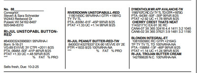 The BARRON FALL SALE 2025 120 N. 3rd Street, Barron WI, 54812 Great offering of genetics... Contact Agent: Aaron Ray Tompkins 336-363-4639 Catalog | Terms of Auction Download CATALOG Download ADDED LOTS PAGE 1 Download ADDED LOTS PAGE 2 Download ADDED LOTS PAGE 3 Catalog | Terms Download CATALOG Download ADDED LOTS PAGE 1 Download ADDED LOTS PAGE 2 Download ADDED LOTS PAGE 3 All Items (132) Cattle (102) Embryos (12) Semen (18) Categories All Items (132) Cattle (102) Embryos (12) Semen (18) Search Item #: Keyword: Search Catalog Item #: Keyword: 20 items per page 50 items per page 100 items per page Go to page #: 2 , 3 , 4 , 5 , 6 , 7 #69 – EZ-WITT BARB JIZZY JAZZY #840003218787430 99%RHA-I Born: 6-01-23 PTPI +2170 8/25 PTA -319M -51F -23P 37%R 8/25 PTAT +1.79 UC +1.49 38%R 8/25 Due: 11-2-25 Location: 120 N. 3rd Street, Barron WI, 54812 Contact Agent: Aaron Ray Tompkins 336-363-4639 More Info / Bid Now Track this Item No Bids Starting at $1,500.00 Login to Bid #69 – EZ-WITT BARB JIZZY JAZZY Starting at $1,500.00 Login to Bid More Details More Info / Bid Track Item #840003218787430 99%RHA-I Born: 6-01-23 PTPI +2170 8/25 PTA -319M -51F -23P 37%R 8/25 PTAT +1.79 UC +1.49 38%R 8/25 Due: 11-2-25 Location: 120 N. 3rd Street, Barron WI, 54812 Contact Agent: Aaron Ray Tompkins 336-363-4639 #70 – NAT-WAY EYE CANDY HONEST #840003266245362 99%RHA-I Born: 8-06-23 Not Classified PTPI +2418 8/25 PTA -540M -5F -14P 32%R 8/25 PTAT +2.22 UC +1.22 31%R 8/25 *** % FAT % PRO Fresh: 8-31-25 Location: 120 N. 3rd Street, Barron WI, 54812 Contact Agent: Aaron Ray Tompkins 336-363-4639 More Info / Bid Now Track this Item No Bids Starting at $1,500.00 Login to Bid #70 – NAT-WAY EYE CANDY HONEST Starting at $1,500.00 Login to Bid More Details More Info / Bid Track Item #840003266245362 99%RHA-I Born: 8-06-23 Not Classified PTPI +2418 8/25 PTA -540M -5F -14P 32%R 8/25 PTAT +2.22 UC +1.22 31%R 8/25 *** % FAT % PRO Fresh: 8-31-25 Location: 120 N. 3rd Street, Barron WI, 54812 Contact Agent: Aaron Ray Tompkins 336-363-4639 #71 – LUCAS-J REBEL ZORRO #840003274552818 100%RHA-NA RC Born: 7-25-23 PTPI +2541 PTA -206M +13F +4P 34%R 8/25 PTAT +.23 UC +.29 33%R 8/25 Due in Jan. 2026 to Siemers Parbo-ET #840003243347747 Location: 120 N. 3rd Street, Barron WI, 54812 Contact Agent: Aaron Ray Tompkins 336-363-4639 More Info / Bid Now Track this Item Sold High Bid: $3,400.00 – #54 #71 – LUCAS-J REBEL ZORRO Sold High Bid: $3,400 More Details More Info / Bid Track Item #840003274552818 100%RHA-NA RC Born: 7-25-23 PTPI +2541 PTA -206M +13F +4P 34%R 8/25 PTAT +.23 UC +.29 33%R 8/25 Due in Jan. 2026 to Siemers Parbo-ET #840003243347747 Location: 120 N. 3rd Street, Barron WI, 54812 Contact Agent: Aaron Ray Tompkins 336-363-4639 #72 – LUCAS-J VERN PERSEUS #840003274552833 100%RHA-NA RC Born: 8-16-23 Not Classified PTPI +2476 8/25 PTA -90M -8F +3P 18%R 8/25 PTAT +.84 UC +.47 18%R 8/25 *** % FAT % PRO Fresh: 8-20-25 Location: 120 N. 3rd Street, Barron WI, 54812 Contact Agent: Aaron Ray Tompkins 336-363-4639 More Info / Bid Now Track this Item Sold High Bid: $2,250.00 – #14 #72 – LUCAS-J VERN PERSEUS Sold High Bid: $2,250 More Details More Info / Bid Track Item #840003274552833 100%RHA-NA RC Born: 8-16-23 Not Classified PTPI +2476 8/25 PTA -90M -8F +3P 18%R 8/25 PTAT +.84 UC +.47 18%R 8/25 *** % FAT % PRO Fresh: 8-20-25 Location: 120 N. 3rd Street, Barron WI, 54812 Contact Agent: Aaron Ray Tompkins 336-363-4639 #73 – LUCAS-J TOP GADJET #840003274552791 100%RHA-NA RC Born: 6-01-23 Not Classified PTPI +2539 8/25 PTA +261M +11F +3P 37%R 8/25 PTAT .67 UC +.82 38%R 8/25 *** % FAT % PRO 2-00 X 105 5900 3.7 218 3.0 177 (inc)” Milking 70#/day SCC: 13 Location: 120 N. 3rd Street, Barron WI, 54812 Contact Agent: Aaron Ray Tompkins 336-363-4639 More Info / Bid Now Track this Item No Bids Starting at $1,500.00 Login to Bid #73 – LUCAS-J TOP GADJET Starting at $1,500.00 Login to Bid More Details More Info / Bid Track Item #840003274552791 100%RHA-NA RC Born: 6-01-23 Not Classified PTPI +2539 8/25 PTA +261M +11F +3P 37%R 8/25 PTAT .67 UC +.82 38%R 8/25 *** % FAT % PRO 2-00 X 105 5900 3.7 218 3.0 177 (inc)” Milking 70#/day SCC: 13 Location: 120 N. 3rd Street, Barron WI, 54812 Contact Agent: Aaron Ray Tompkins 336-363-4639 #74 – PENDING 99%RHA-I Born: 9-2-25 Location: 120 N. 3rd Street, Barron WI, 54812 Contact Agent: Aaron Ray Tompkins 336-363-4639 More Info / Bid Now Track this Item Sold High Bid: $2,500.00 – #23 #74 – PENDING Sold High Bid: $2,500 More Details More Info / Bid Track Item 99%RHA-I Born: 9-2-25 Location: 120 N. 3rd Street, Barron WI, 54812 Contact Agent: Aaron Ray Tompkins 336-363-4639 #75 – BREMER ZABRILA WHATSHE #840003224338935 99%RHA-I TR TC TL TD GTPI +2739G 8/25 Born: 7-10-21 GP-83 +VF+V 3Y PTA -567M +34F +13P 84%R 8/25 PTAT +.54 UC +1.31 84%R 8/25 *** % FAT % PRO 1-11 2X 305 18460 5.0 915 3.8 700 365 21520 5.0 1073 3.9 830 3-04 272 24450 4.4 1072 3.6 883 Sells fresh Location: 120 N. 3rd Street, Barron WI, 54812 Contact Agent: Aaron Ray Tompkins 336-363-4639 More Info / Bid Now Track this Item No Bids Starting at $1,500.00 Login to Bid #75 – BREMER ZABRILA WHATSHE Starting at $1,500.00 Login to Bid More Details More Info / Bid Track Item #840003224338935 99%RHA-I TR TC TL TD GTPI +2739G 8/25 Born: 7-10-21 GP-83 +VF+V 3Y PTA -567M +34F +13P 84%R 8/25 PTAT +.54 UC +1.31 84%R 8/25 *** % FAT % PRO 1-11 2X 305 18460 5.0 915 3.8 700 365 21520 5.0 1073 3.9 830 3-04 272 24450 4.4 1072 3.6 883 Sells fresh Location: 120 N. 3rd Street, Barron WI, 54812 Contact Agent: Aaron Ray Tompkins 336-363-4639 #76 – NAT-WAY COLLISION HAITI #840003266245367 99%RHA-I Born: 10-09-23 PTPI +2144 8/25 PTA -518M -36F -21P 35%R 8/25 PTAT +1.58 UC +1.42 37%R 8/25 Due: 12-15-25 to Jinx Location: 120 N. 3rd Street, Barron WI, 54812 Contact Agent: Aaron Ray Tompkins 336-363-4639 More Info / Bid Now Track this Item Sold High Bid: $2,900.00 – #47 #76 – NAT-WAY COLLISION HAITI Sold High Bid: $2,900 More Details More Info / Bid T