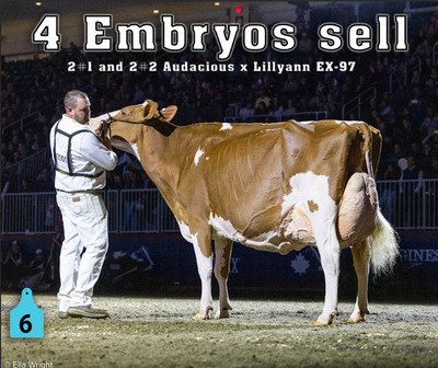 Spring Sensation Sale 3962 Batavia-Elba Townline Rd, Oakfield NY, 14125 Live lots - IVF Sessions - Embryos - Elite Choices Contact Agent: Catalog | Terms of Auction Download CATALOG Download ADDED LOTS Download ADDED LOT 1A Download SALE ORDER Download UPDATES ISSUU CATALOG LINK Catalog | Terms Download CATALOG Download ADDED LOTS Download ADDED LOT 1A Download SALE ORDER Download UPDATES ISSUU CATALOG LINK All Items (89) No Category (89) Categories All Items (89) No Category (89) Search Item #: Keyword: Search Catalog Item #: Keyword: 20 items per page 50 items per page 100 items per page Go to page #: 1 , 2 , 3 , 4 , 5 #1 – OAKFIELD EPIPHANY KOMET-ET 840 3300022795 H.N. 8464 Born December 16, 2025 WINTER CALF Location: 3962 Batavia-Elba Townline Rd, Oakfield NY, 14125 More Info / Bid Now Track this Item Sold High Bid: $36,750.00 – #358 #1 – OAKFIELD EPIPHANY KOMET-ET Sold High Bid: $36,750 More Details More Info / Bid Track Item 840 3300022795 H.N. 8464 Born December 16, 2025 WINTER CALF Location: 3962 Batavia-Elba Townline Rd, Oakfield NY, 14125 #1A – MAS X KANDY CANE EMBRYOS FOUR #1 IVF EMBRYOS Mutually Agreeable Sire Will be made to export globally if desired Location: 3962 Batavia-Elba Townline Rd, Oakfield NY, 14125 More Info / Bid Now Track this Item Sold High Bid: $4,000.00 – #341 Auction Type: Quantity x Price Quantity: 4 #1A – MAS X KANDY CANE EMBRYOS Quantity x PriceQuantity: 4 Sold High Bid: $4,000 More Details More Info / Bid Track Item FOUR #1 IVF EMBRYOS Mutually Agreeable Sire Will be made to export globally if desired Location: 3962 Batavia-Elba Townline Rd, Oakfield NY, 14125 #2 – OAKFIELD DEVOUR LYNX-ET *RC 840 3278136397 H.N. 72948 Born December 19, 2023 *RC *CV *TP *TE *TC WINTER SENIOR TWO YEAR OLD Fresh: December 29, 2025 Location: 3962 Batavia-Elba Townline Rd, Oakfield NY, 14125 More Info / Bid Now Track this Item High Bid: $1,550.00 – #1086 Login to Bid #2 – OAKFIELD DEVOUR LYNX-ET *RC High Bid: $1,550 Login to Bid More Details More Info / Bid Track Item 840 3278136397 H.N. 72948 Born December 19, 2023 *RC *CV *TP *TE *TC WINTER SENIOR TWO YEAR OLD Fresh: December 29, 2025 Location: 3962 Batavia-Elba Townline Rd, Oakfield NY, 14125 #3 – OAKFIELD ACE LETHAL-RED-ET 840 3300022643 H.N. 8312 Born August 5, 2025 *CV *TE *TC *TY *TL SUMMER YEARLING GPTA +2.40T +1.45UDC +1.16FLC 79R 12/25 Location: 3962 Batavia-Elba Townline Rd, Oakfield NY, 14125 More Info / Bid Now Track this Item Sold High Bid: $12,900.00 – #1021 #3 – OAKFIELD ACE LETHAL-RED-ET Sold High Bid: $12,900 More Details More Info / Bid Track Item 840 3300022643 H.N. 8312 Born August 5, 2025 *CV *TE *TC *TY *TL SUMMER YEARLING GPTA +2.40T +1.45UDC +1.16FLC 79R 12/25 Location: 3962 Batavia-Elba Townline Rd, Oakfield NY, 14125 #4 – OAKFIELD A LIONHEART-RED-ET 840 3300022685 H.N. 8354 Born September 4, 2025 FALL CALF Location: 3962 Batavia-Elba Townline Rd, Oakfield NY, 14125 More Info / Bid Now Track this Item Sold High Bid: $7,000.00 – #1072 #4 – OAKFIELD A LIONHEART-RED-ET Sold High Bid: $7,000 More Details More Info / Bid Track Item 840 3300022685 H.N. 8354 Born September 4, 2025 FALL CALF Location: 3962 Batavia-Elba Townline Rd, Oakfield NY, 14125 #5 – OAKFIELD HS LILO-RED-ET 840 3300022345 H.N. 8014 Born December 1, 2025 WINTER CALF GPTA +2.06T +1.45UDC +.49FLC 79R 1/26 Location: 3962 Batavia-Elba Townline Rd, Oakfield NY, 14125 More Info / Bid Now Track this Item Sold High Bid: $8,300.00 – #1072 #5 – OAKFIELD HS LILO-RED-ET Sold High Bid: $8,300 More Details More Info / Bid Track Item 840 3300022345 H.N. 8014 Born December 1, 2025 WINTER CALF GPTA +2.06T +1.45UDC +.49FLC 79R 1/26 Location: 3962 Batavia-Elba Townline Rd, Oakfield NY, 14125 #6 – AUDACIOUS X LILLYANN RED EMBRYOS (2) #1 and (2) #2 IVF embryos from sexed semen Exportable to Canada Location: Trans Ova, MD Location: 3962 Batavia-Elba Townline Rd, Oakfield NY, 14125 More Info / Bid Now Track this Item Sold High Bid: $1,225.00 – #1012 Auction Type: Quantity x Price Quantity: 4 #6 – AUDACIOUS X LILLYANN RED EMBRYOS Quantity x PriceQuantity: 4 Sold High Bid: $1,225 More Details More Info / Bid Track Item (2) #1 and (2) #2 IVF embryos from sexed semen Exportable to Canada Location: Trans Ova, MD Location: 3962 Batavia-Elba Townline Rd, Oakfield NY, 14125 #7 – OAKFIELD MOOV FRENZY-RED-ET 840 3278136384 H.N. 7281 Donor Dam Born December 10, 2023 WINTER SENIOR TWO YEAR OLD Fresh: January 5, 2026 Location: 3962 Batavia-Elba Townline Rd, Oakfield NY, 14125 More Info / Bid Now Track this Item Sold High Bid: $18,250.00 – #343 #7 – OAKFIELD MOOV FRENZY-RED-ET Sold High Bid: $18,250 More Details More Info / Bid Track Item 840 3278136384 H.N. 7281 Donor Dam Born December 10, 2023 WINTER SENIOR TWO YEAR OLD Fresh: January 5, 2026 Location: 3962 Batavia-Elba Townline Rd, Oakfield NY, 14125 #8 – MS AIRCRAFT FLAIR-RED 840 3300022811 H.N. 8480 Born January 5, 2026 WINTER CALF S: Farnear Aircraft-ET *RC D: Oakfield Moov Frenzy-Red-ET Location: 3962 Batavia-Elba Townline Rd, Oakfield NY, 14125 More Info / Bid Now Track this Item Sold High Bid: $3,500.00 – #500 #8 – MS AIRCRAFT FLAIR-RED Sold High Bid: $3,500 More Details More Info / Bid Track Item 840 3300022811 H.N. 8480 Born January 5, 2026 WINTER CALF S: Farnear Aircraft-ET *RC D: Oakfield Moov Frenzy-Red-ET Location: 3962 Batavia-Elba Townline Rd, Oakfield NY, 14125 #9 – OAKFIELD ALPHA FICKLE-ET *RC 840 3286536477 H.N. 7856 Born September 15, 2024 *RC *TE *TC *TY *TV MILKING YEARLING Bred 10/23/25 to Benjo LR Mega-P-Red 799HO135 due 7/29/26 (ultrasound female) Location: 3962 Batavia-Elba Townline Rd, Oakfield NY, 14125 More Info / Bid Now Track this Item Sold High Bid: $8,500.00 – #500 #9 – OAKFIELD ALPHA FICKLE-ET *RC Sold High Bid: $8,500 More Details More Info / Bid Track Item 840 3286536477 H.N. 7856 Born September 15, 2024 *RC *TE *TC *TY *TV MILKING YEARLING Bred 10/23/25 to Benjo LR Mega-P-Red 799HO135 due 7/29/26 (ultrasound female) Location: 