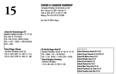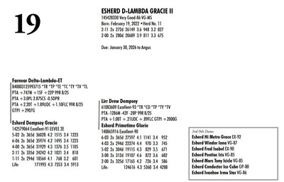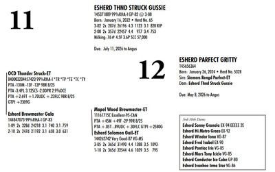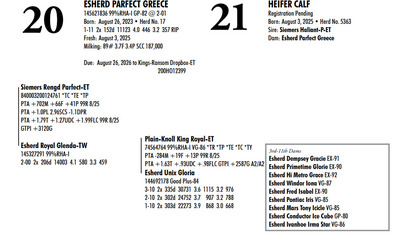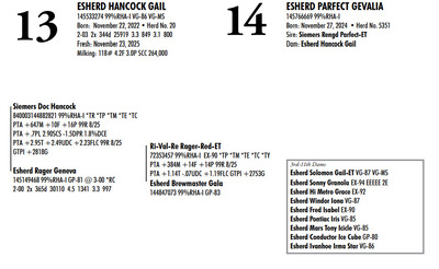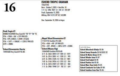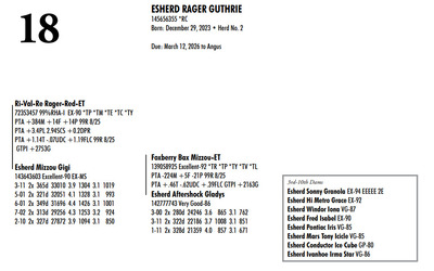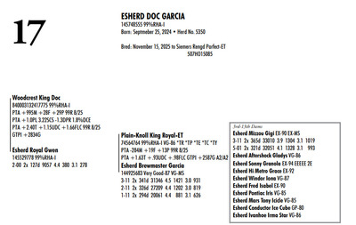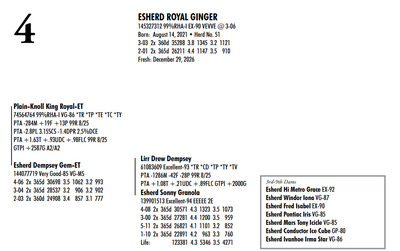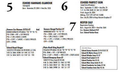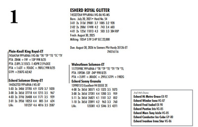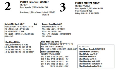 Esh Dairy Dispersal Auction 3736 E. Newport Rd, Gordonville PA, 17529 KNOW WHAT YOU BUY HEIFER SALE 2022 Contact Agent: Katie 717-543-7883 Catalog | Register For Auction | Terms of Auction Download SALE BILL Download CATALOG Catalog | Register | Terms Download SALE BILL Download CATALOG All Items (107) Cattle (100) No Category (7) Categories All Items (107) Cattle (100) No Category (7) Search Item #: Keyword: Search Catalog Item #: Keyword: 20 items per page 50 items per page 100 items per page Go to page #: 1 , 2 , 3 , 4 , 5 #1 – ESHERD ROYAL GLITTER 145327264 99%RHA-I VG-86 VG-MS Born: July 20, 2021Herd No. 54 3-01 2x 313d 29081 3.7 1085 3.2 928 2-02 2x 288d 17498 4.2 743 3.4 603 4-01 2x 125d 11813 4.3 503 3.3 384 RIP Fresh: August 30, 2025 Milking: 103# 3.9F 3.4P SCC 22,000 Due: August 30, 2026 to Siemers Pfct Hardy 35126-ET T 7HO16116 Location: 3736 E. Newport Rd, Gordonville PA, 17529 Contact Agent: Katie 717-543-7883 More Info / Bid Now Track this Item Register for Auction No Bids Starting at $1,000.00 Login to Bid #1 – ESHERD ROYAL GLITTER Starting at $1,000.00 Login to Bid More Details More Info / Bid Track Item Register 145327264 99%RHA-I VG-86 VG-MS Born: July 20, 2021Herd No. 54 3-01 2x 313d 29081 3.7 1085 3.2 928 2-02 2x 288d 17498 4.2 743 3.4 603 4-01 2x 125d 11813 4.3 503 3.3 384 RIP Fresh: August 30, 2025 Milking: 103# 3.9F 3.4P SCC 22,000 Due: August 30, 2026 to Siemers Pfct Hardy 35126-ET T 7HO16116 Location: 3736 E. Newport Rd, Gordonville PA, 17529 Contact Agent: Katie 717-543-7883 #2 – ESHERD HAS-IT-ALL GOOGLE 145748519 Born: September 7, 2024 Herd No. 5345 Bred: January 2, 2026 to Siemers Pfct Hardy 35126-ET 7HO16116 Location: 3736 E. Newport Rd, Gordonville PA, 17529 Contact Agent: Katie 717-543-7883 More Info / Bid Now Track this Item Register for Auction No Bids Starting at $1,000.00 Login to Bid #2 – ESHERD HAS-IT-ALL GOOGLE Starting at $1,000.00 Login to Bid More Details More Info / Bid Track Item Register 145748519 Born: September 7, 2024 Herd No. 5345 Bred: January 2, 2026 to Siemers Pfct Hardy 35126-ET 7HO16116 Location: 3736 E. Newport Rd, Gordonville PA, 17529 Contact Agent: Katie 717-543-7883 #3 – ESHERD PARFECT GINNY 145618546 99%RHA-I Born: September 22, 2023 Herd No. 993 Fresh: December 18, 2025 Milking: 63# 4.8F 4.0P SCC 857,000 Location: 3736 E. Newport Rd, Gordonville PA, 17529 Contact Agent: Katie 717-543-7883 More Info / Bid Now Track this Item Register for Auction No Bids Starting at $1,000.00 Login to Bid #3 – ESHERD PARFECT GINNY Starting at $1,000.00 Login to Bid More Details More Info / Bid Track Item Register 145618546 99%RHA-I Born: September 22, 2023 Herd No. 993 Fresh: December 18, 2025 Milking: 63# 4.8F 4.0P SCC 857,000 Location: 3736 E. Newport Rd, Gordonville PA, 17529 Contact Agent: Katie 717-543-7883 #4 – ESHERD ROYAL GINGER 145327312 99%RHA-I EX-90 VEVVE @ 3-06 Born: August 14, 2021 Herd No. 51 3-03 2x 360d 35288 3.8 1345 3.2 1121 2-01 2x 365d 26211 4.4 1147 3.5 910 Fresh: December 29, 2026 Location: 3736 E. Newport Rd, Gordonville PA, 17529 Contact Agent: Katie 717-543-7883 More Info / Bid Now Track this Item Register for Auction No Bids Starting at $1,000.00 Login to Bid #4 – ESHERD ROYAL GINGER Starting at $1,000.00 Login to Bid More Details More Info / Bid Track Item Register 145327312 99%RHA-I EX-90 VEVVE @ 3-06 Born: August 14, 2021 Herd No. 51 3-03 2x 360d 35288 3.8 1345 3.2 1121 2-01 2x 365d 26211 4.4 1147 3.5 910 Fresh: December 29, 2026 Location: 3736 E. Newport Rd, Gordonville PA, 17529 Contact Agent: Katie 717-543-7883 #5 – ESHERD HANNANS GLAMOUR 145766678 Born: November 29, 2024 Herd No. 5353 Location: 3736 E. Newport Rd, Gordonville PA, 17529 Contact Agent: Katie 717-543-7883 More Info / Bid Now Track this Item Register for Auction No Bids Starting at $1,000.00 Login to Bid #5 – ESHERD HANNANS GLAMOUR Starting at $1,000.00 Login to Bid More Details More Info / Bid Track Item Register 145766678 Born: November 29, 2024 Herd No. 5353 Location: 3736 E. Newport Rd, Gordonville PA, 17529 Contact Agent: Katie 717-543-7883 #6 – ESHERD PARFECT GEM 145621416 99%RHA-I Born: September 17, 2023 Herd No. 25 1-11 2x 129d 8638 4.2 362 3.2 278 RIP Fresh: August 26, 2026 Milking: 72# 3.9F 3.4P SCC 13,000 Due: July 28. 2026 to Kings-Ransom Dropbox-ET Location: 3736 E. Newport Rd, Gordonville PA, 17529 Contact Agent: Katie 717-543-7883 More Info / Bid Now Track this Item Register for Auction No Bids Starting at $1,000.00 Login to Bid #6 – ESHERD PARFECT GEM Starting at $1,000.00 Login to Bid More Details More Info / Bid Track Item Register 145621416 99%RHA-I Born: September 17, 2023 Herd No. 25 1-11 2x 129d 8638 4.2 362 3.2 278 RIP Fresh: August 26, 2026 Milking: 72# 3.9F 3.4P SCC 13,000 Due: July 28. 2026 to Kings-Ransom Dropbox-ET Location: 3736 E. Newport Rd, Gordonville PA, 17529 Contact Agent: Katie 717-543-7883 #7 – HEIFER CALF Registration Pending Born: August 26, 2025 Herd No. 5364 Location: 3736 E. Newport Rd, Gordonville PA, 17529 Contact Agent: Katie 717-543-7883 More Info / Bid Now Track this Item Register for Auction No Bids Starting at $1,000.00 Login to Bid #7 – HEIFER CALF Starting at $1,000.00 Login to Bid More Details More Info / Bid Track Item Register Registration Pending Born: August 26, 2025 Herd No. 5364 Location: 3736 E. Newport Rd, Gordonville PA, 17529 Contact Agent: Katie 717-543-7883 #8 – ESHERD SLAMDUNK GALAXY 145334811 99%RHA-I GP-83 @ 2-08 Born: November 27, 2027 Herd No. 61 2-09 2x 313d 27027 3.8 1034 3.1 843 1-10 2x 294d 20198 3.9 790 3.2 643 3-09 2x 89d 8022 4.0 317 3.1 249 RIP Fresh: September 13, 2025 Milking: 109# 4.3F 3.1P SCC 71,000 Location: 3736 E. Newport Rd, Gordonville PA, 17529 Contact Agent: Katie 717-543-7883 More Info / Bid Now Track this Item Register for Auction No Bids Starting at $1,000.00 Login to Bid #8 – ESHERD SLAMDUNK GALAXY Starting at $1,000.00 Login to Bid More Details More Info / Bid Track Item Register 145334811 99%RHA-I GP-83 @ 2-08 Born: Novembe