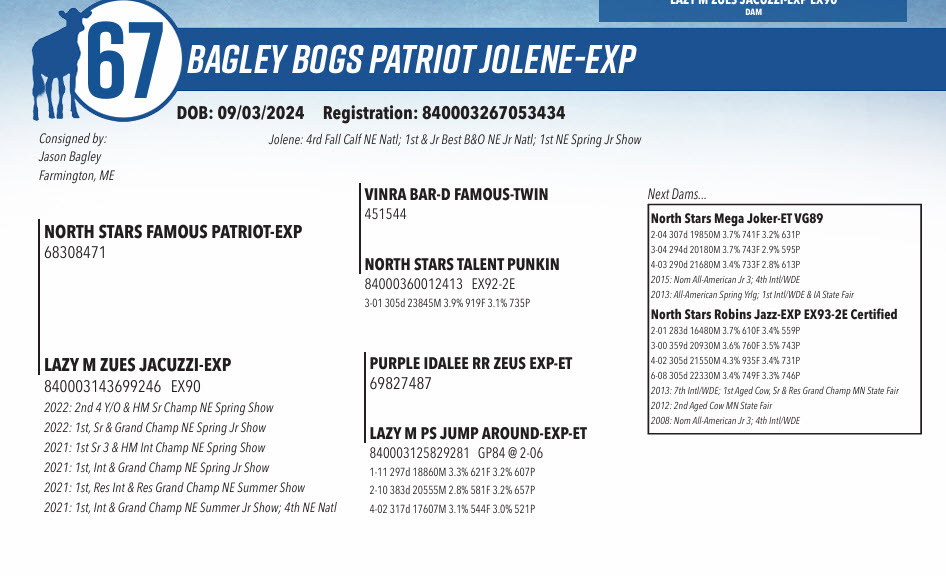 Jolene: 4rd Fall Calf NE Natl; 1st & Jr Best B&O NE Jr Natl; 1st NE Spring Jr Show