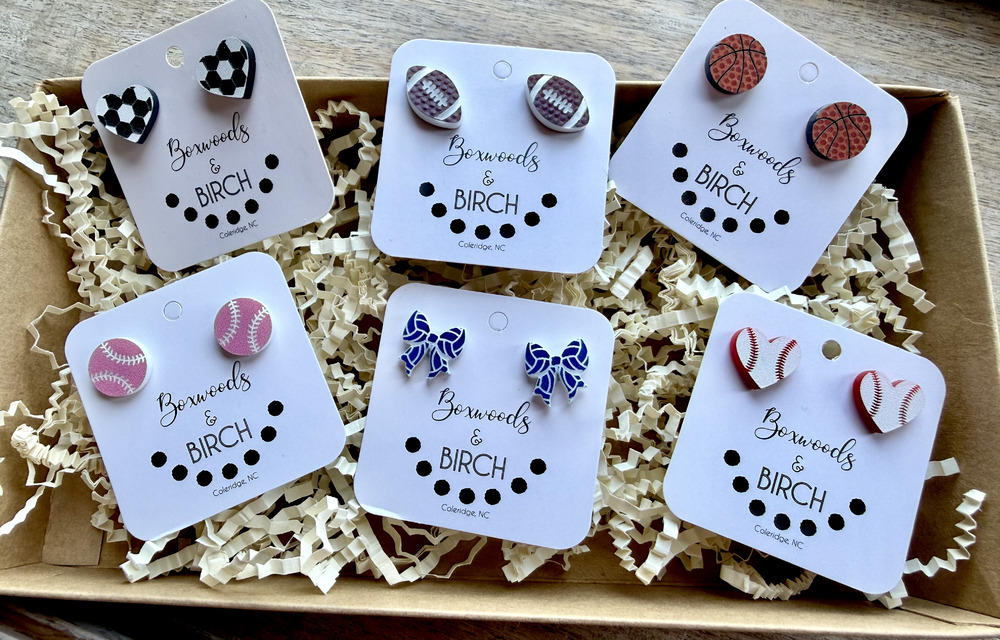 6 sets of Sports Earrings Made and Donated by Boxwood and Birch