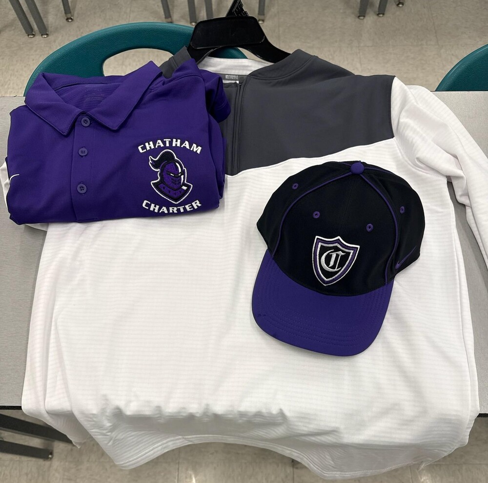 Chatham Charter XL Nike polo and XL White Russell long sleeve pullover with Nike hat