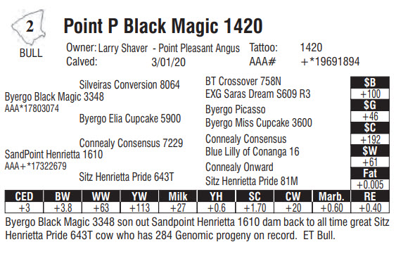 Byergo Black Magic 3348 son out Sandpoint Henrietta 1610 dam back to all time great Sitz Henrietta Pride 643T cow who has 284 Genomic progeny on record. ET Bull.