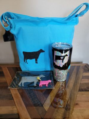 30 oz Epoxy Glitter Tumbler, Canvas Purse, Makeup Bag, and Keychain. Retail Value $80 DONATED BY: Cow_Hen_Sow Creations c/o Randi Dibert, OH