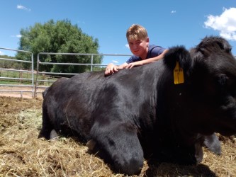The steer project is his favorite project. His steers name is T-Bone, he is an Angus Hereford cross. He has such a personality and he loves him. He knows he will taste great.