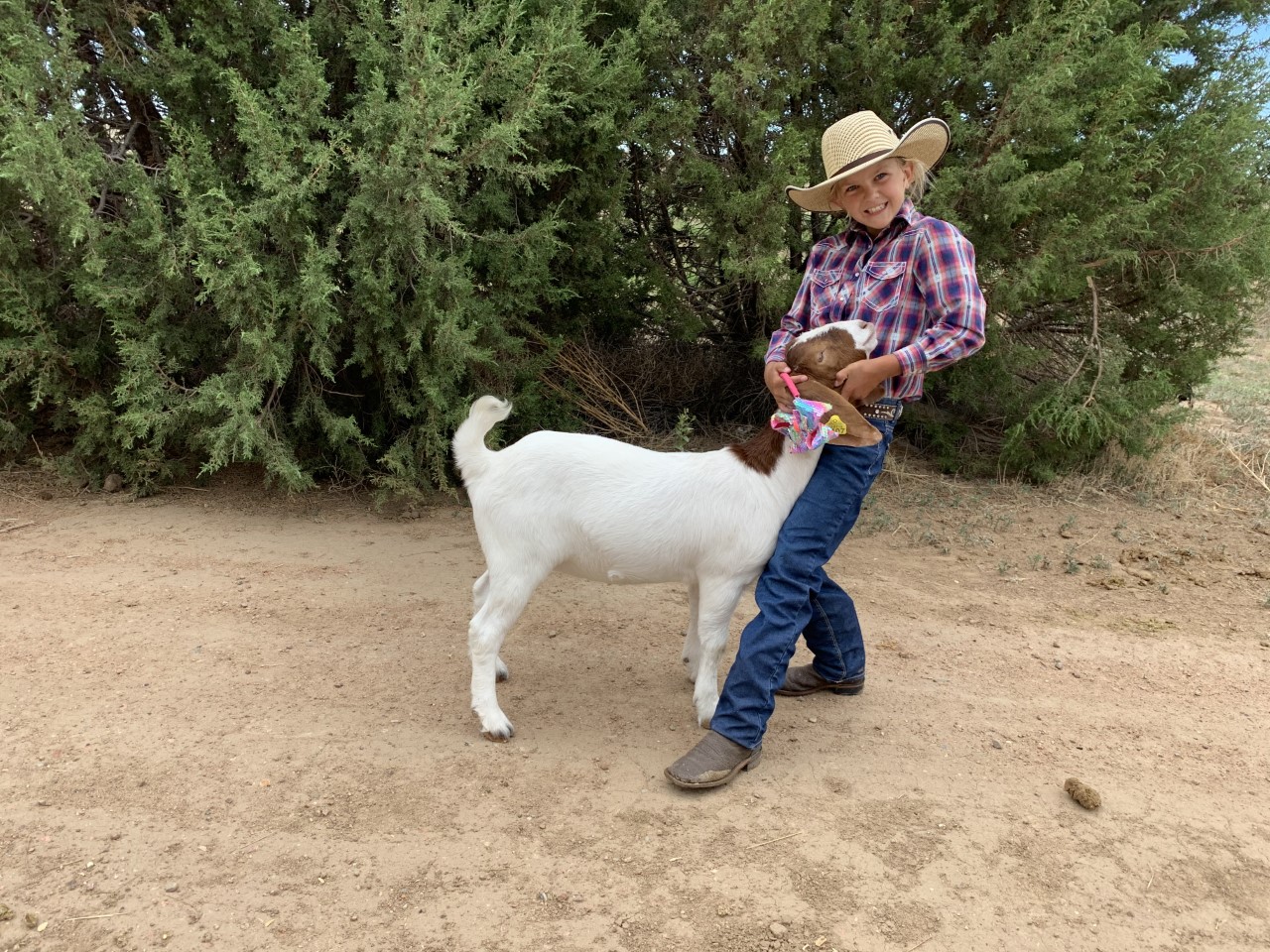 4-H Market goat- Exhibitor is Madilynn and this is her first year in 4-H. She is a 3rd generation Custer County 4-H member and she is showing Market Goat. This is her boer goat and his name is Doug. He has a very funny personality and he is very smart. She would like to take the time to invite you to the Custer County Fair and Livestock auction.