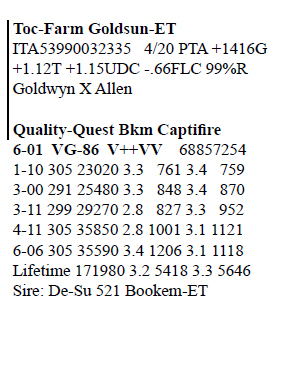 5-11 GP-82 +VGG+ 71595281 98%RHA-I Born 7/20/13 1-09 297 19060 3.5 676 3.3 626 2-08 275 17020 3.5 537 3.5 595 3-06 283 30340 3.5 1059 3.2 956 4-06 301 30420 3.8 1170 3.4 1029 5-07 297 27840 4.3 1189 3.3 909 6-07 163 16907 3.5 599 3.0 509 RIP Last test- 107 lbs 4.3%F 2.9%P SCC 87,000 Fresh 2/20/20 Bred 7/10/20, Due 4/16/21 to 566HO1281 Darkhorse