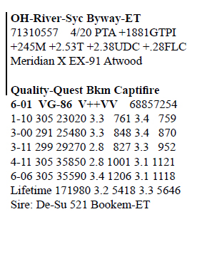 4-00 GP-83 VVG++ 3135480806 98%RHA-I Born 8/7/16 1-11 365 30862 3.6 1125 3.2 981 3-04 208 24344 3.8 918 3.0 719 RIP Last test- 102 lbs 3.3%F 2.9%P SCC 13,000 Fresh 1/6/20 Bred 5/5/20, Due 2/9/21 to 551HO3855 Moovin*RC