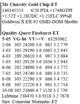 74425568 96%RHA-NA Born 8/13/18 1-10 31 1768 4.0 70 2.6 46 RIP Last test- 67 lbs 3.6%F 2.4%P SCC 15,000 Fresh 7/1/20 Bred 8/17/20 to 250HO12961 King Doc