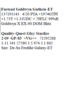 4-10 GP-83 +VG++ 74265430 99%RHA-NA Born 10/4/15 2-00 338 31260 3.9 1233 3.0 947 3-01 365 38034 3.9 1473 2.9 1121 4-08 57 6172 3.5 217 2.5 154 RIP Last test- 113 lbs 3.2%F 2.4%P SCC 650,000 Fresh 6/5/20 Bred 8/4/20 to 250HO12961 King Doc