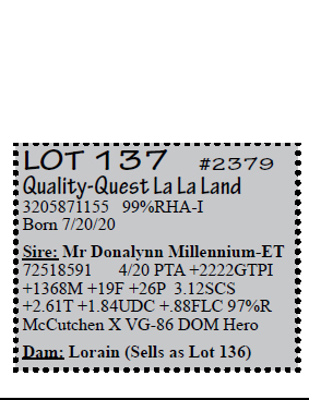 Quality-Quest La La Land 3205871155 99%RHA-I Born 7/20/20 Sire