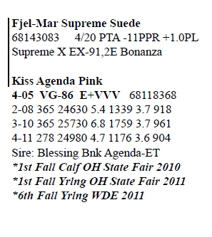 68168675 Tattoo MS10 Born 9/5/15 1-08 365 19906 4.6 909 3.5 690 2-11 365 21909 5.2 1130 3.7 817 4-03 320 26001 5.2 1353 3.5 900 5-04 199 17643 4.0 706 3.2 568 RIP Last test- 64 lbs 3.5%F 3.2%P Fresh 1/15/20 Bred 7/22/20 to 7BS872 Tequila