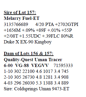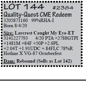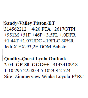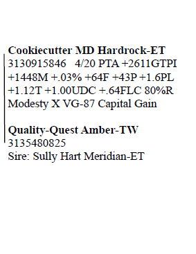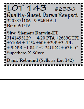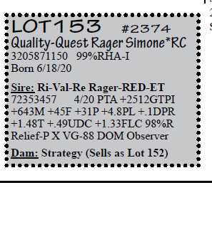 3143410953 100%RHA-NA Born 6/18/18 2-00 44 2733 3.9 107 2.5 68 RIP Last test -70 lbs 3.6%F 2.4%P SCC 115,000 Fresh 6/18/20