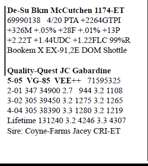 68168675 Tattoo MS10 Born 9/5/15 1-08 365 19906 4.6 909 3.5 690 2-11 365 21909 5.2 1130 3.7 817 4-03 320 26001 5.2 1353 3.5 900 5-04 199 17643 4.0 706 3.2 568 RIP Last test- 64 lbs 3.5%F 3.2%P Fresh 1/15/20 Bred 7/22/20 to 7BS872 Tequila