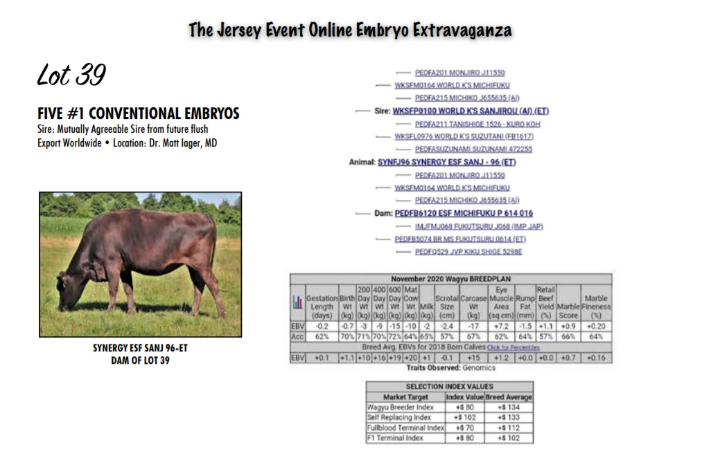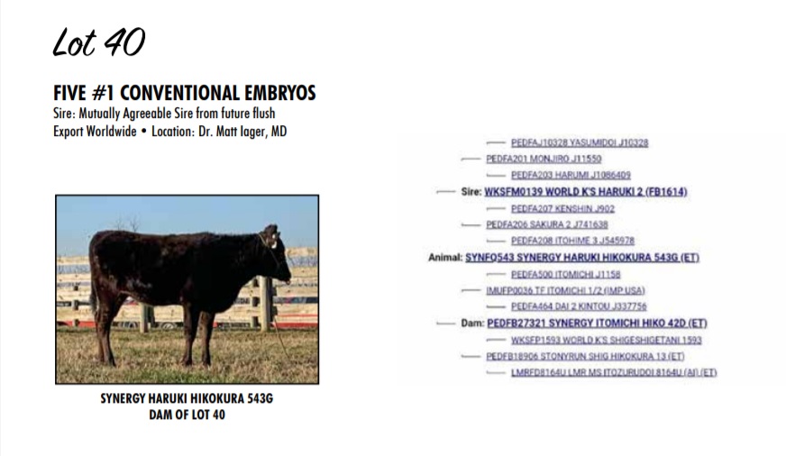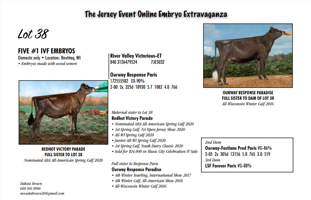 Search Item #: Keyword: Search Catalog Item #: Keyword: 20 items per page 50 items per page 100 items per page Go to page #: 1065 , 1066 , 1067 , 1068 , 1069 , 1070 #30 – FIVE #1 IVF EMBRYOS- JOEL X WELCOME Export eligible Location: Boviteq, WI Embryos made with sexed semen Location: Boviteq, WI, , More Info / Bid Now Track this Item Sold High Bid: $475.00 Auction Type: Quantity x Price Quantity: 5 Bidding has closed on this lot #30 – FIVE #1 IVF EMBRYOS- JOEL X WELCOME Quantity x PriceQuantity: 5 Sold High Bid: $475 Closed More Details More Info / Bid Track Item Export eligible Location: Boviteq, WI Embryos made with sexed semen Location: Boviteq, WI, , #31 – FIVE #1 CONVENTIONAL EMBRYOS- MAGIC GENIE X FIREFLY Export Worldwide Location: Dr. Matt Iager, MD Embryos made with sexed semen Location: Dr. Matt Iager, MD, , More Info / Bid Now Track this Item Sold High Bid: $425.00 Auction Type: Quantity x Price Quantity: 5 Bidding has closed on this lot #31 – FIVE #1 CONVENTIONAL EMBRYOS- MAGIC GENIE X FIREFLY Quantity x PriceQuantity: 5 Sold High Bid: $425 Closed More Details More Info / Bid Track Item Export Worldwide Location: Dr. Matt Iager, MD Embryos made with sexed semen Location: Dr. Matt Iager, MD, , #32 – FOUR #1 IVF EMBRYOS- VIP X DREAMER Domestic Only Location: Trans Ova, MD Embryos made with sexed semen Location: Trans Ova, MD, , More Info / Bid Now Track this Item Sold High Bid: $325.00 Auction Type: Quantity x Price Quantity: 4 Bidding has closed on this lot #32 – FOUR #1 IVF EMBRYOS- VIP X DREAMER Quantity x PriceQuantity: 4 Sold High Bid: $325 Closed More Details More Info / Bid Track Item Domestic Only Location: Trans Ova, MD Embryos made with sexed semen Location: Trans Ova, MD, , #33 – FIVE #1 IVF EMBRYOS- TEQUILA X FLOWER Domestic Only Location: Trans Ova, MD Embryos made with sexed semen Location: Trans Ova, MD, , More Info / Bid Now Track this Item Sold High Bid: $325.00 Auction Type: Quantity x Price Quantity: 5 Bidding has closed on this lot #33 – FIVE #1 IVF EMBRYOS- TEQUILA X FLOWER Quantity x PriceQuantity: 5 Sold High Bid: $325 Closed More Details More Info / Bid Track Item Domestic Only Location: Trans Ova, MD Embryos made with sexed semen Location: Trans Ova, MD, , #34 – FOUR #1 IVF EMBRYOS- JOEL X JUNIPER Domestic only Location: Trans Ova, MD Embryos made with RSF semen Location: Trans Ova, MD, , More Info / Bid Now Track this Item Sold High Bid: $425.00 Auction Type: Quantity x Price Quantity: 4 Bidding has closed on this lot #34 – FOUR #1 IVF EMBRYOS- JOEL X JUNIPER Quantity x PriceQuantity: 4 Sold High Bid: $425 Closed More Details More Info / Bid Track Item Domestic only Location: Trans Ova, MD Embryos made with RSF semen Location: Trans Ova, MD, , #35 – FOUR #1 IVF EMBRYOS- BONTINO X CHEESE Domestic Only Location: Trans Ova, Turlock, CA Embryos made with RSF semen Location: Trans Ova, Turlock, CA, , More Info / Bid Now Track this Item Sold High Bid: $550.00 Auction Type: Quantity x Price Quantity: 4 Bidding has closed on this lot #35 – FOUR #1 IVF EMBRYOS- BONTINO X CHEESE Quantity x PriceQuantity: 4 Sold High Bid: $550 Closed More Details More Info / Bid Track Item Domestic Only Location: Trans Ova, Turlock, CA Embryos made with RSF semen Location: Trans Ova, Turlock, CA, , #36 – FIVE #1 CONVENTIONAL EMBRYOS- FIZZ X CINNAMON Export Worldwide Location: Dr. Matt Iager, MD Embryos made with sexed semen Location: Dr. Matt Iager, MD, , More Info / Bid Now Track this Item Sold High Bid: $325.00 Auction Type: Quantity x Price Quantity: 5 Bidding has closed on this lot #36 – FIVE #1 CONVENTIONAL EMBRYOS- FIZZ X CINNAMON Quantity x PriceQuantity: 5 Sold High Bid: $325 Closed More Details More Info / Bid Track Item Export Worldwide Location: Dr. Matt Iager, MD Embryos made with sexed semen Location: Dr. Matt Iager, MD, , #37 – FIVE #1 CONVENTIONAL EMBRYOS- TEQUILA X AIMEE Export Worldwide Location: Dr. Matt Iager, MD Embryos made with sexed semen Location: Dr. Matt Iager, MD, , More Info / Bid Now Track this Item Sold High Bid: $250.00 Auction Type: Quantity x Price Quantity: 5 Bidding has closed on this lot #37 – FIVE #1 CONVENTIONAL EMBRYOS- TEQUILA X AIMEE Quantity x PriceQuantity: 5 Sold High Bid: $250 Closed More Details More Info / Bid Track Item Export Worldwide Location: Dr. Matt Iager, MD Embryos made with sexed semen Location: Dr. Matt Iager, MD, , #38 – FIVE #1 IVF EMBRYOS- VICTORIOUS X PARIS Domestic only Location: Bovtiteq, WI Embryos made with sexed semen Location: Bovtiteq, WI, , More Info / Bid Now Track this Item Sold High Bid: $375.00 Auction Type: Quantity x Price Quantity: 5 Bidding has closed on this lot #38 – FIVE #1 IVF EMBRYOS- VICTORIOUS X PARIS Quantity x PriceQuantity: 5 Sold High Bid: $375 Closed More Details More Info / Bid Track Item Domestic only Location: Bovtiteq, WI Embryos made with sexed semen Location: Bovtiteq, WI, , #39 – FIVE #1 CONVENTIONAL EMBRYOS- MAS X SANJ 96 Sire: Mutually Agreeable Sire from future flush Export Worldwide Location: Dr. Matt Iager, MD Location: Dr. Matt Iager, MD, , More Info / Bid Now Track this Item Sold High Bid: $400.00 Auction Type: Quantity x Price Quantity: 5 Bidding has closed on this lot #39 – FIVE #1 CONVENTIONAL EMBRYOS- MAS X SANJ 96 Quantity x PriceQuantity: 5 Sold High Bid: $400 Closed More Details More Info / Bid Track Item Sire: Mutually Agreeable Sire from future flush Export Worldwide Location: Dr. Matt Iager, MD Location: Dr. Matt Iager, MD, , #40 – FIVE #1 CONVENTIONAL EMBRYOS- MAS X 543G Sire: Mutually Agreeable Sire from future flush Export Worldwide Location: Dr. Matt Iager, MD Location: Dr. Matt Iager, MD, , More Info / Bid Now Track this Item Sold High Bid: $400.00 Auction Type: Quantity x Price Quantity: 5 Bidding has closed on this lot #40 – FIVE #1 CONVENTIONAL EMBRYOS- MAS X 543G Quantity x PriceQuantity: 5 Sold High Bid: $400 Closed More Details More Info / Bid Track Item Sire: Mutually Agreeable Sire from future flush Export Worldw