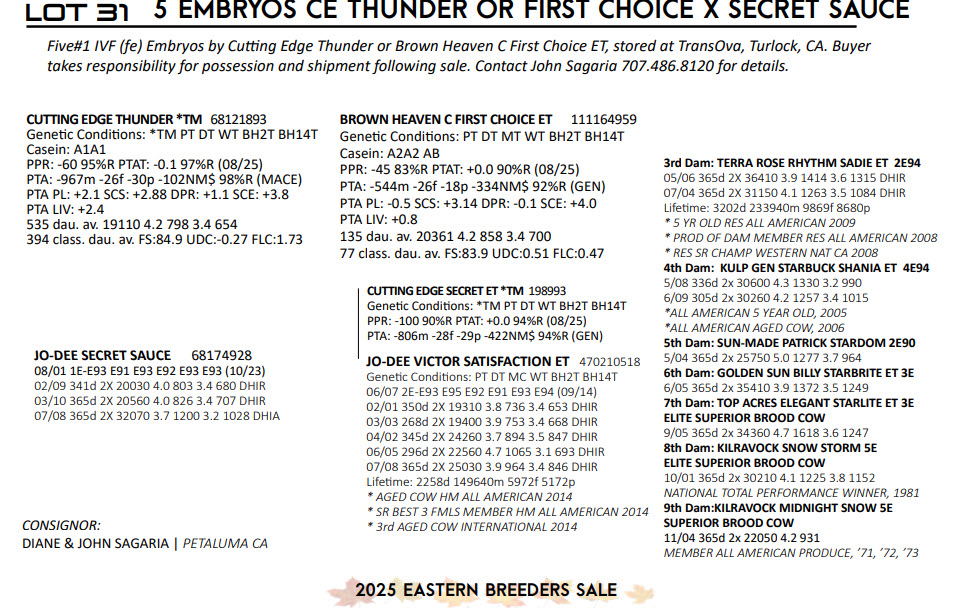 Five#1 IVF (fe) Embryos by Cutting Edge Thunder or Brown Heaven C First Choice ET, stored at TransOva, Turlock, CA. Buyer