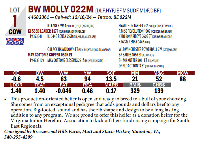We are proud to offer this heifer as a donation heifer for the Virginia Junior Hereford Association to kick off their fundraising campaign for South East Regionals.