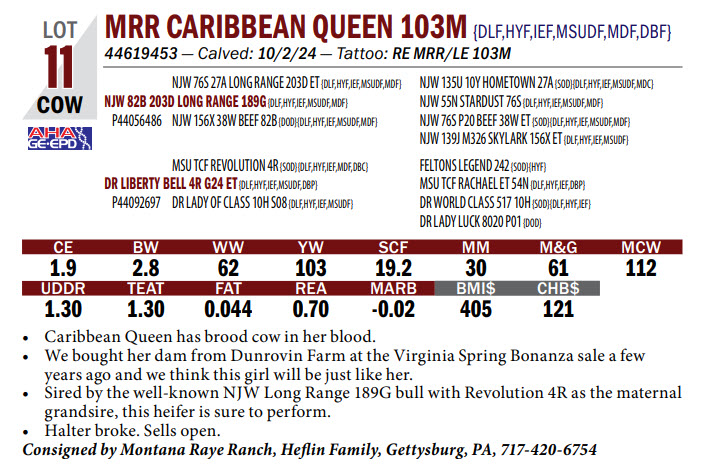 44619453 — Calved: 10/2/24 — Tattoo: RE MRR/LE 103M Caribbean Queen has brood cow in her blood.