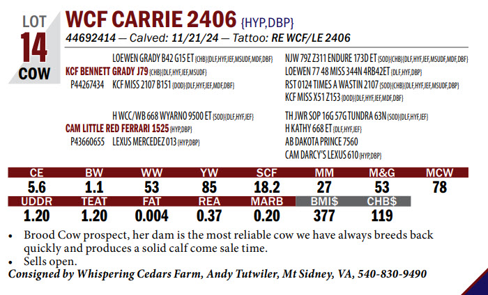 44692414 — Calved: 11/21/24 — Tattoo: RE WCF/LE 2406 Brood Cow prospect, her dam is the most reliable cow we have always breeds back