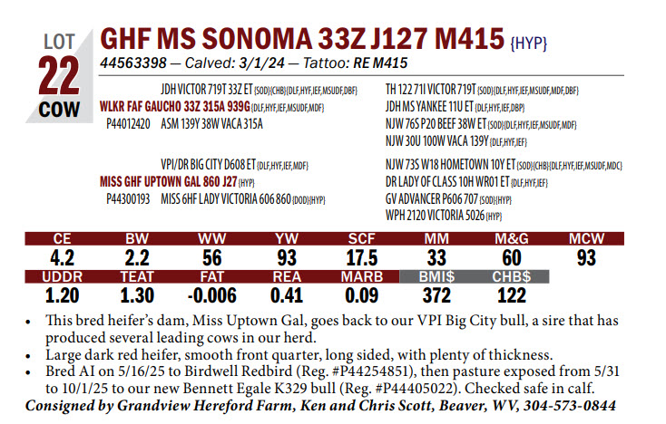 44563398 — Calved: 3/1/24 — Tattoo: RE M415 This bred heifer’s dam, Miss Uptown Gal, goes back to our VPI Big City bull, a sire that has