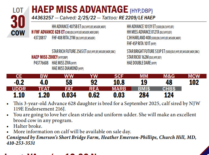 44363257 — Calved: 2/25/22 — Tattoo: RE 2209/LE HAEP This 3-year-old Advance 628 daughter is bred for a September 2025, calf sired by NJW