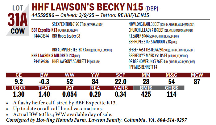 44559586 — Calved: 3/9/25 — Tattoo: RE HHF/LE N15 A flashy heifer calf, sired by BBF Expedite K13.