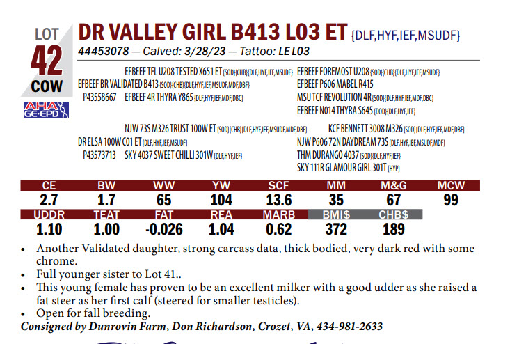 44453078 — Calved: 3/28/23 — Tattoo: LE L03 Another Validated daughter, strong carcass data, thick bodied, very dark red with some