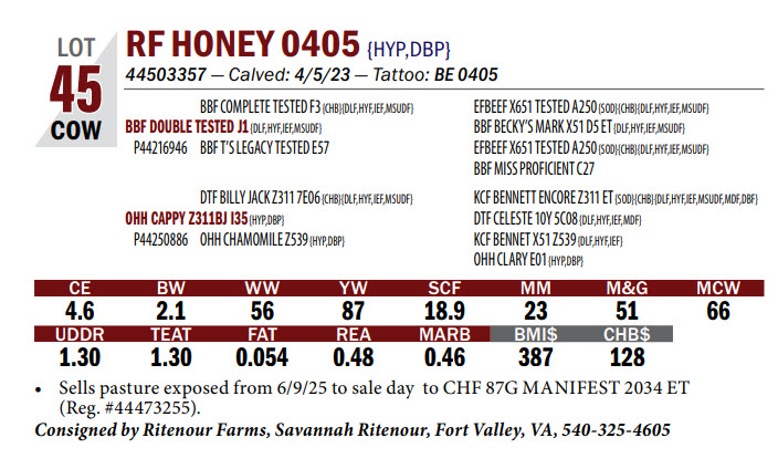 44503357 — Calved: 4/5/23 — Tattoo: BE 0405 Sells pasture exposed from 6/9/25 to sale day to CHF 87G MANIFEST 2034 ET