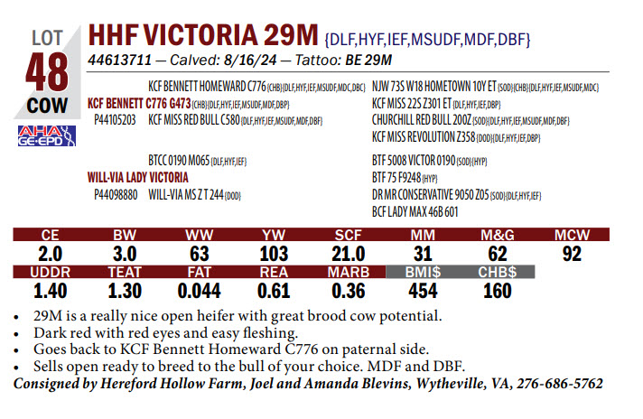 44613711 — Calved: 8/16/24 — Tattoo: BE 29M 29M is a really nice open heifer with great brood cow potential.