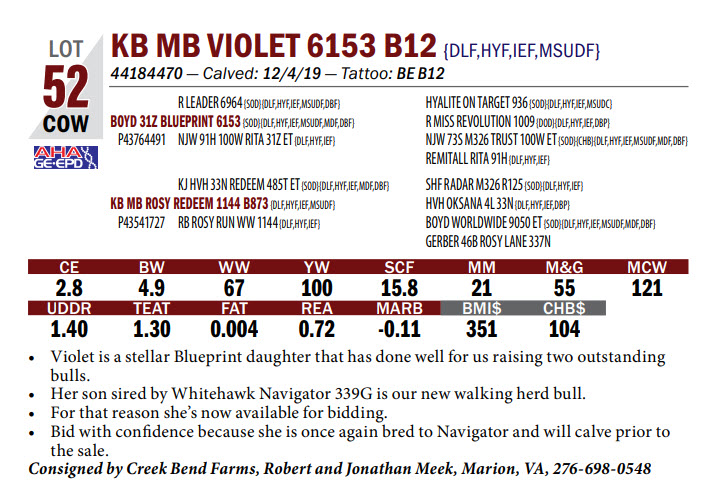 44184470 — Calved: 12/4/19 — Tattoo: BE B12 Violet is a stellar Blueprint daughter that has done well for us raising two outstanding