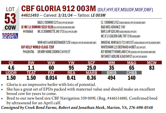 44611493 — Calved: 3/31/24 — Tattoo: LE 003MGloria is an impressive heifer with lots of potential.