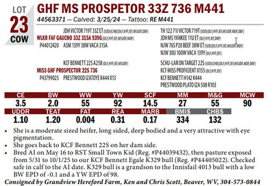 44563371 — Calved: 3/25/24 — Tattoo: RE M441 She is a moderate sized heifer, long sided, deep bodied and a very attractive with eye pigmentation. She goes back to KCF Bennett 22S on her dam side. Bred AI on May 16 to RST Small Town Kid (Reg. #P44039432), then pasture exposed from 5/31 to 10/1/25 to our KCF Bennett Egale K329 bull (Reg. #P44405022). Checked safe in calf to the AI date. K329 bull is a grandson to the Innisfail 4013 bull with a low BW EPD of -0.1 and a YW EPD of 98.