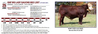 44456353 — Calved: 2/25/23 — Tattoo: RE L307 MS L307 is a stout two-year-old cow with a great udder. She is long bodied, very correct in her structure and good on her feet. Spring heifer calf by her side born 4/4/25. The heifer calf is one of the first calves from our Bennett Eagle K329 bull. Pastue exposed from 5/11 to 9/1/25 our CMF 333E Lewis 862L (Reg. #P44575434), then exposed from 9/1 to 10/1/25 to our Bennett K329 (Reg. #P44012420). Checked safe in calf
