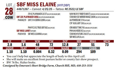 44610928 — Calved: 10/10/24 — Tattoo: RE BBF/LE M25 M25 is a member of our all time favorite cow family. They are always very maternal and easy keepers. She can be the perfect start to a legacy foundation in your herd. Pre-breeding vaccinations will be done prior to the sale and open ready to breed. BW 80 lbs., WW 618 lbs., YW 949 lbs.