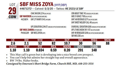 44671272 — Calved: 5/3/25 — Tattoo: RE 2523/LE SBF This May calf is green but is developing into a nice brood cow prospect. You can’t help but admire her straight top and overall appearance. BW 79 lbs. Halter broke.